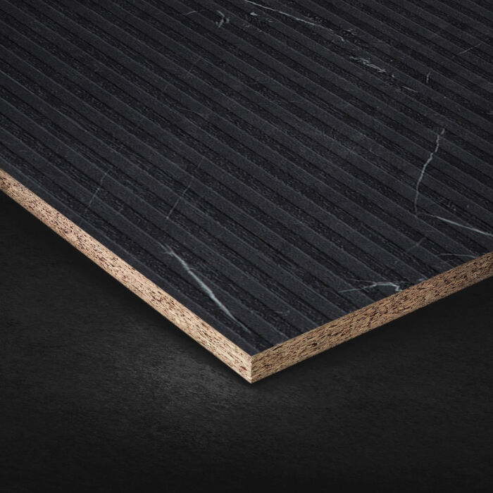 Placa de PAL melaminat cu decorul FC18 Riga de la CLEAF combină rafinamentul marmurei negre cu o textură arhitecturală modernă, oferind un impact vizual puternic și elegant. Suprafața în nuanțe de negru intens este traversată subtil de venaturi albe, creând un contrast spectaculos. Structura Riga, cu liniile sale reliefate, accentuează caracterul decorului și adaugă profunzime, făcându-l ideal pentru spații sofisticate și contemporane.